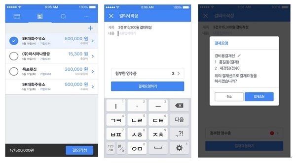 비즈플레이 경비지출관리 서비스는 PC는 물론 모바일 앱에서도 지출결의를 작성하고 사용 한도를 확인할 수 있다.