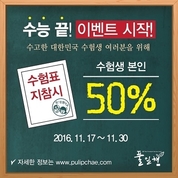 프리미엄 한식뷔페 브랜드 풀잎채(대표 정인기)가 고생한 수험생들을 격려하기 위해 수능 당일 17일부터 30일까지 대폭 할인 이벤트를 진행한다. 이번 이벤트는 풀잎채 매장 방문 및 계산 시 수험생 표를 제시하면 50% 즉시 할인이 적용되며 전국 매장에서 진행될 예정이다. (김해점, 양산점 등 일부 매장 제외) 이벤트 관련 자세한 정보 및 진행 매장은 공식 홈페이지 및 블로그를 통해 확인 가능하다. 풀잎채 관계자는 "오랜 시간 수능 준비로 몸과 마음 모두 지쳐 있는 수험생들을 격려하고자 이번 이벤트를 마련했다”며 “친구, 가족과 함께 풀잎채에서 건강한 음식 드시고 힐링하는 기회가 되길 바란다”고 전했다. 한편, 최근 풀잎채는 새로운 브랜드인 이색 월드쌈 전문점 ‘올위드쌈’을 론칭하면서 한식 브랜드 확장에 나서고 있다. 한식은 물론 세계 각국의 다양한 쌈 요리를 샐러드바 형태로 한 곳에서 즐길 수 있는 것이 특징이다. 기사, 이미지 제공 :풀잎채 웹 사이트 :http://www.pulipchae.com/